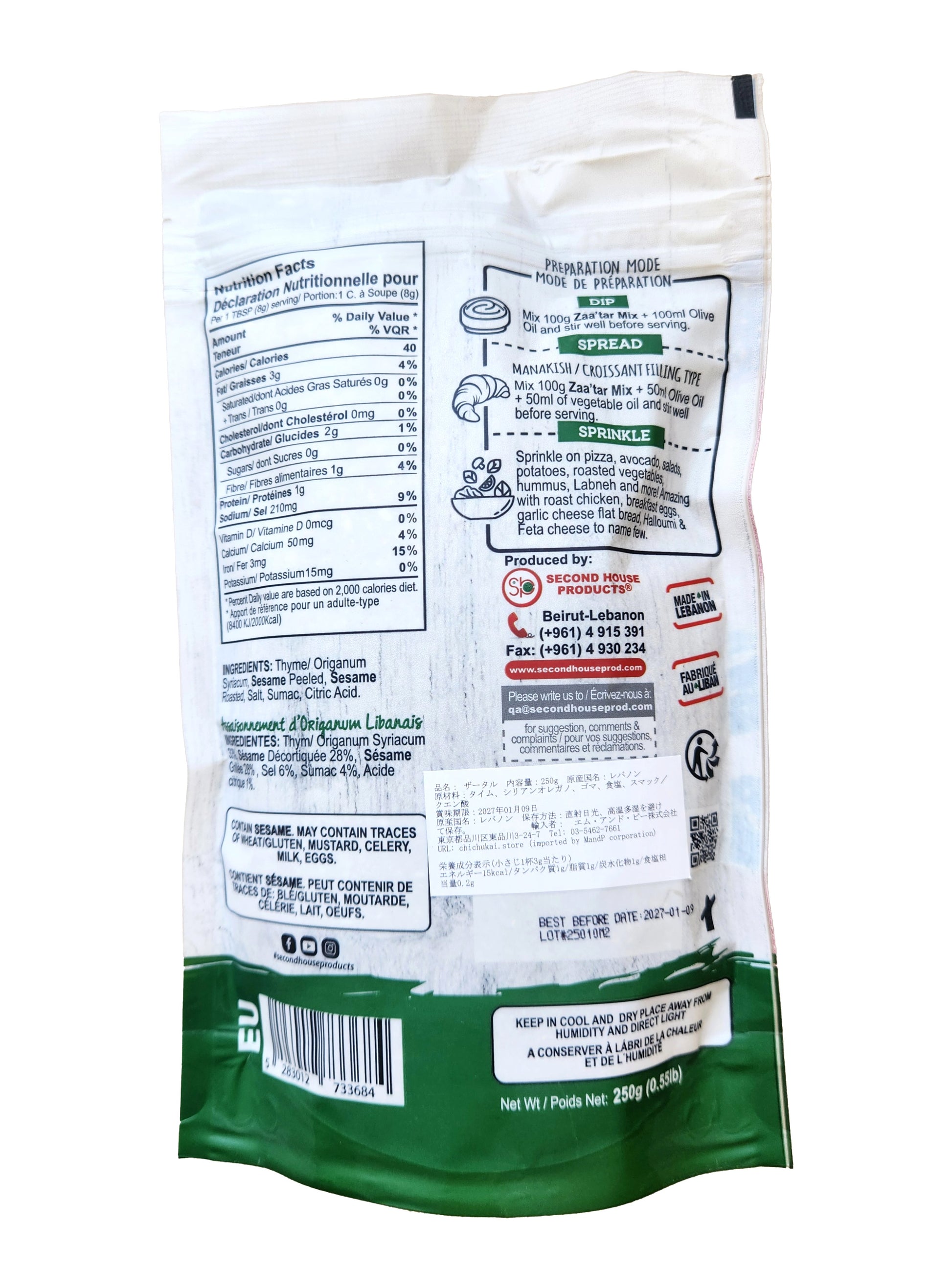 | 原材料 | タイム、シリアンオレガノ、 ゴマ、塩、スマック/クエン酸 |